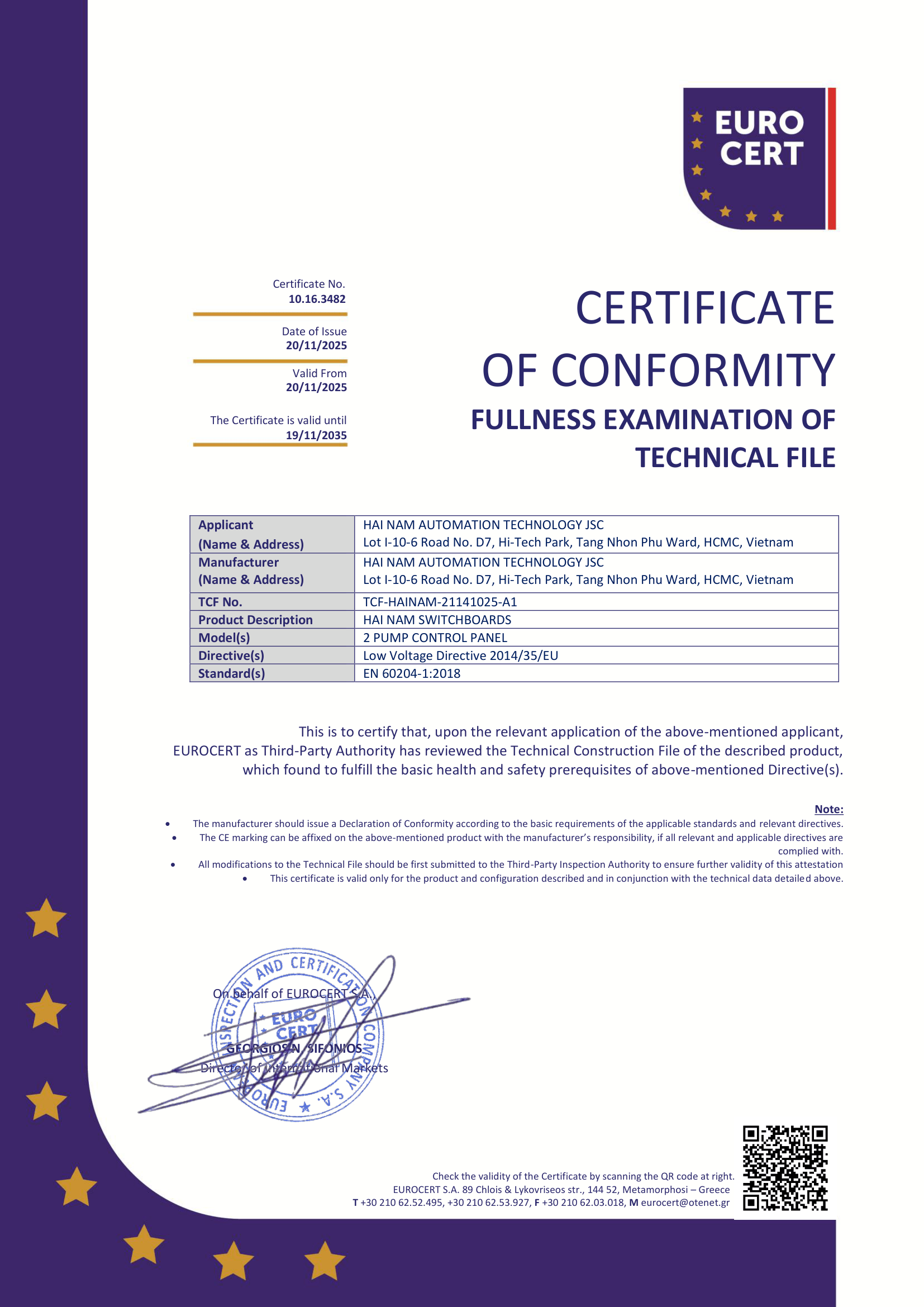Hai Nam Automation Technology Joint Stock Company is proud to be among the few electrical switchboard manufacturers in Vietnam to obtain the CE Marking Certificate of Conformity, issued by Eurocert, a recognized European certification body.